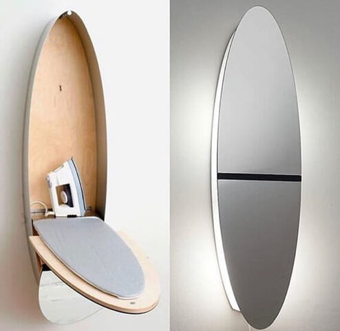 一見、間接照明付きの鏡?です。 上の部分を開くと、その鏡の裏がアイロン台になっている感じです!