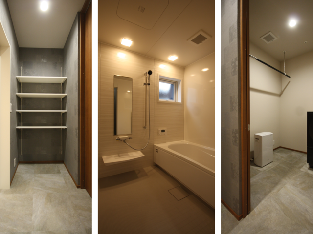 #脱衣室 には家族一人ひとりの使いやすさを考えた可動棚を採用し、収納の高さも自由に調整可能。隣接するランドリールームとの連携によって、洗濯・乾燥・片付けまでの一連の動きが効率的に完結する、実用性の高い設計です。