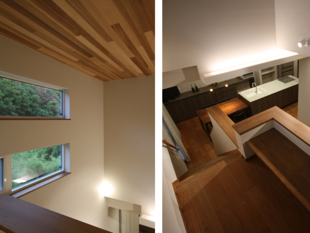 吹き抜けの天井には、濃色の米杉羽目板をアクセントとして採用。