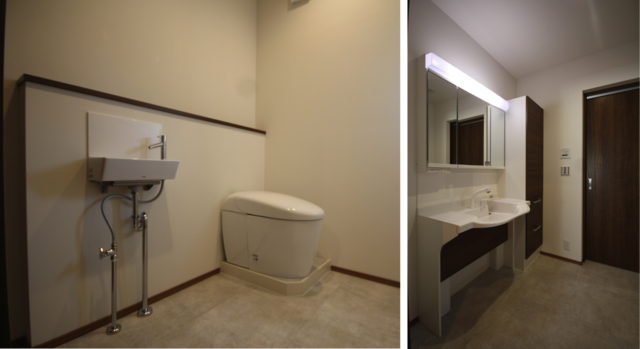 #トイレは便座の高さまでこだわり、座りやすさ・立ち上がりやすさを重視。手洗いスペースも車いすでの使用が可能な設計とし、下部が空いたタイプを採用しました。