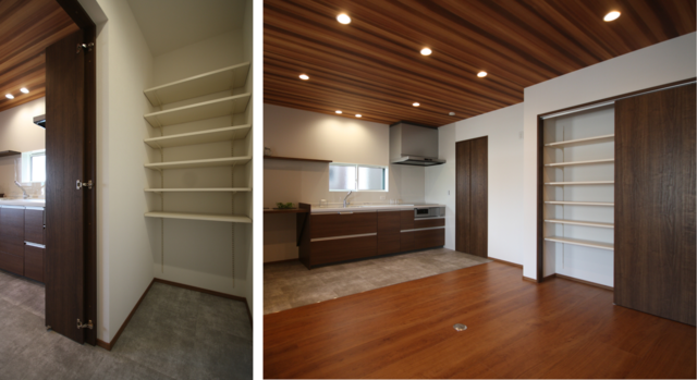 カップボードの代わりに設けた大型の食器収納は、扉を開けると内部が一気に見渡せる仕様に。