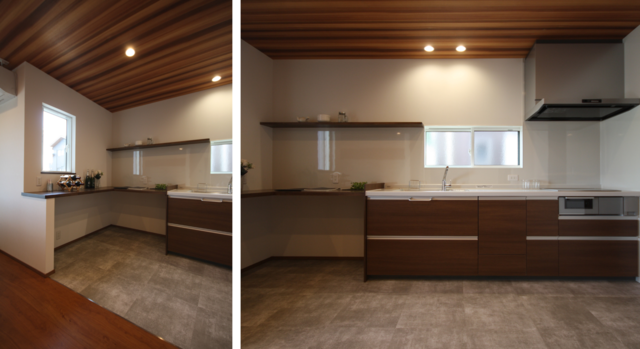 ・#キッチンは壁付けスタイルに加え、家電カウンターとL字に配置することで、調理動線が一直線に。移動の無駄を省き、車いすでもラクに動けるレイアウトを実現しました。