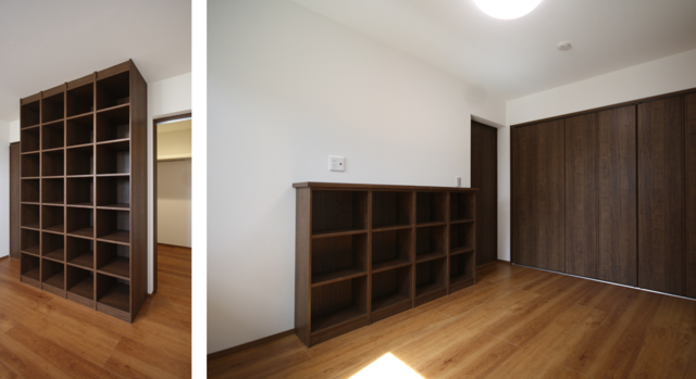 寝室には造作で本棚を設置。購入予定のデスク寸法に合わせて製作したことで、空間に無駄がなく統一感ある仕上がりに。