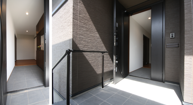 #玄関アプローチは段差を極力なくしたフラット仕様に。屋外用と室内用の車いすをスムーズに乗り換えられるよう、設計に細かな気遣いを重ねています。