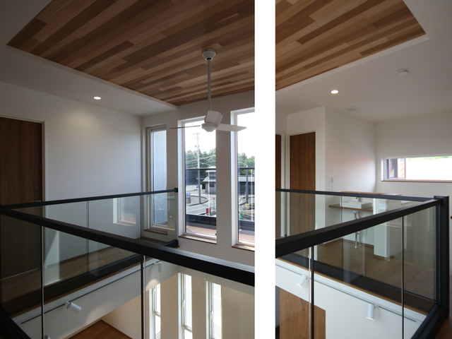 吹き抜け空間に配置されたガラス手すりは、高窓から差し込む自然光を遮らず、リビング全体にやわらかな明るさをもたらします。