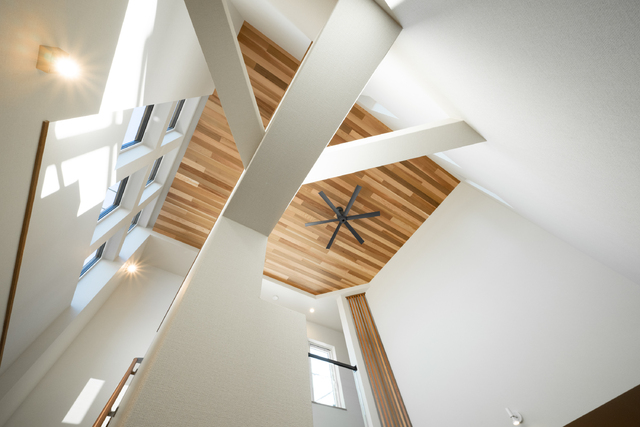 ・吹き抜けの天井には#羽目板をあしらい、白い壁とのコントラストが海外リゾートのような雰囲気を演出しています。