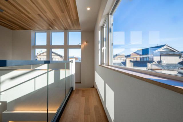・2階ホールに設けた大きな窓からは、#吹き抜けのガラス手すりを通してリビングに爽やかな光が届き、明るく開放的な印象を与えます。