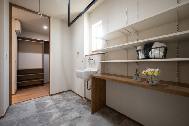・サンルームに隣接して設けた#ファミリークローク洗濯した衣類をそのまま片づけられる便利さが。家事の手間を軽減しながら、暮らしにゆとりを生み出します。