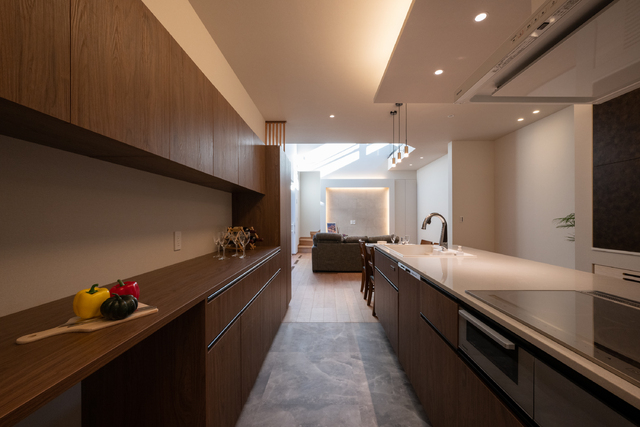 背面のカップボードもキッチンと同色で統一されており、空間にまとまりと高級感をもたらします。