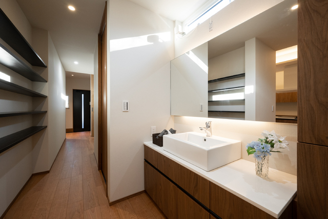 ホールからウォークスルーでアクセスできる間取りのため、外出先から帰宅してすぐ手洗いができる動線を確保しました。