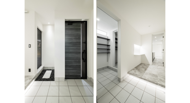 ・脇玄関には、家族4人分の靴がすっきり収まる#シュークロークを計画。お出かけや帰宅時の動線がスムーズになり、日々の使いやすさがぐっと高まります。