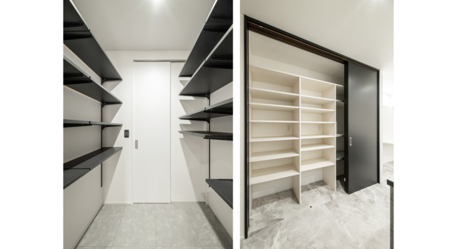 さらに、シュークロークから直接アクセスできる#パントリーは、奥様のこだわりが光る間取り。買い物後の荷物もすぐに片づけられる、快適な動線計画です。