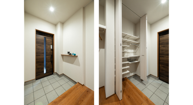 ・#玄関には大容量のシュークロークと外出着をかけるコート掛けを配置。花粉やウイルスを生活空間に持ち込ませない、衛生的な間取りになりました。