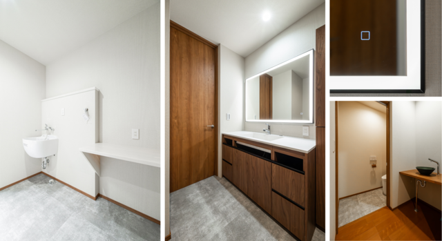 ミラーにはタッチ操作式の#LEDライト付きタイプを採用し、スイッチを入れると光の縁がやさしく広がる「ハリウッドミラー」に。