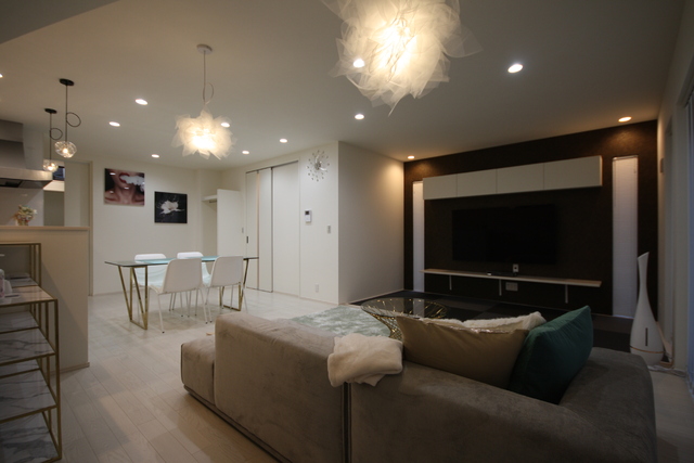 #リビングリビングは約20帖の広さを活かし、白をベースにしたインテリアでまとめることで、清潔感と開放感を演出。