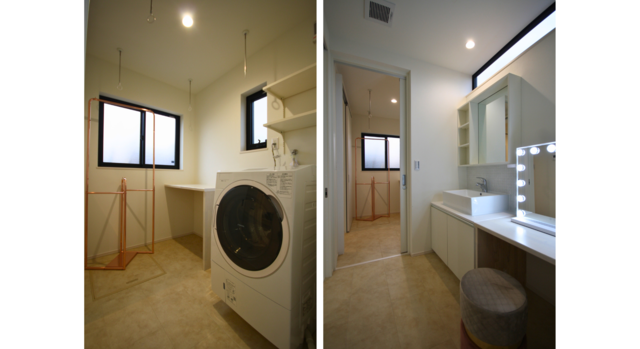 ・洗面スペースにはメイクカウンターを併設。朝の忙しい時間帯でも、家族それぞれがゆとりを持って身支度できるよう配慮されています。