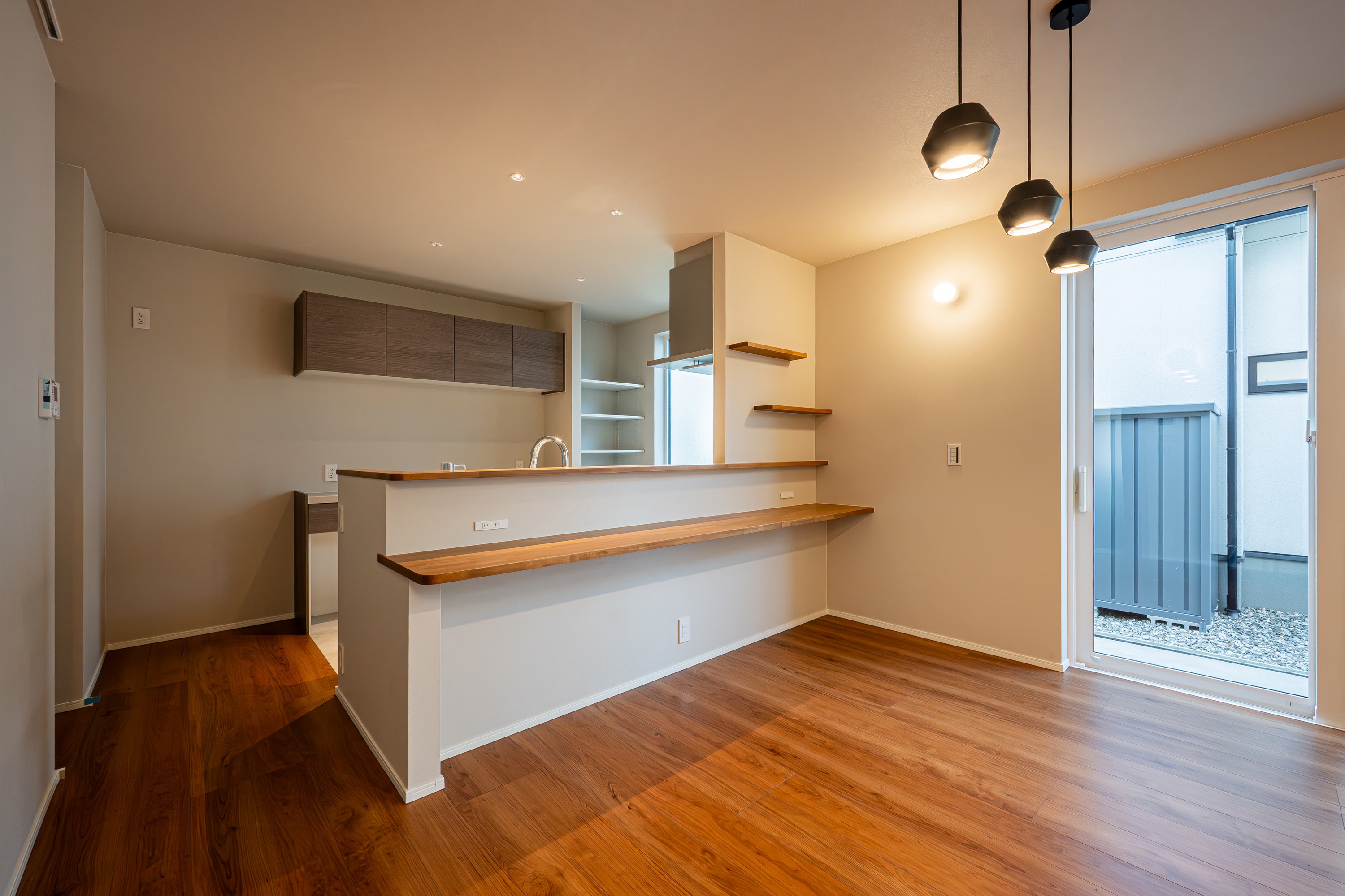 ダイニングテーブル上に下がるペンダントライトが空間のアクセントとなり、